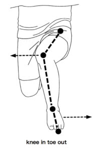 ・膝が外側に倒れ、足部が内側に回る動き(ニーイントゥアウト)