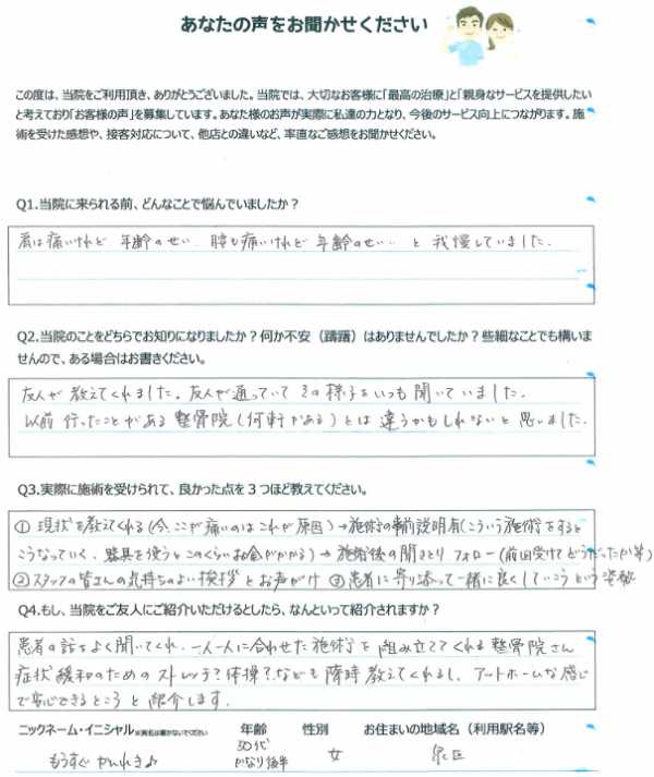 「体の痛みや不安が解消!」仙台市宮城野区 61歳 女性